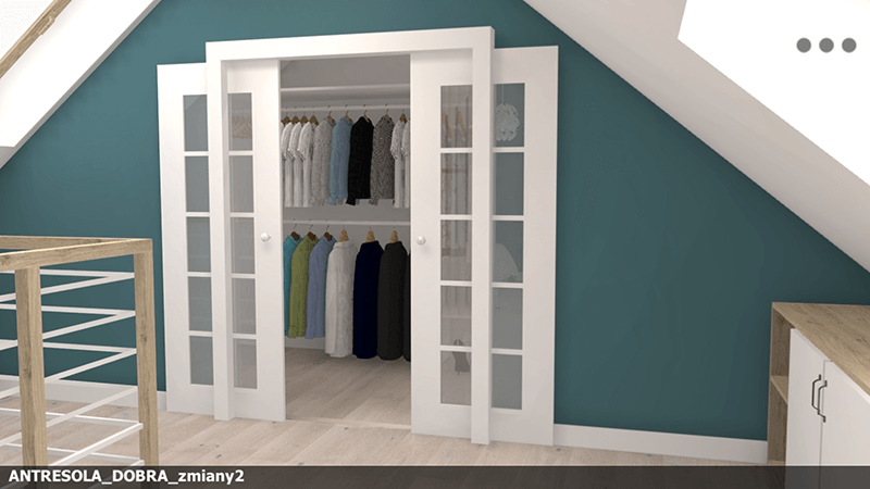 Wejście do garderoby chciałabym aby były rozsuwane jak na zdjęciu „drzwi garderoba”, jednakże ze względu na skosy dobrze, aby była blokada i nie rozsuwały się do końca. Otwór ma wymiary: szerokość 127 cm oraz wysokość: 203 cm i wygląda jak na zdjęciu „garderoba antresola”. Drzwi może w stylu „inspiracja garderoba” tylko że z mlecznym szkłem i rozsuwane w dwie strony. Mieszkanie znajduje się we Wrocławiu.