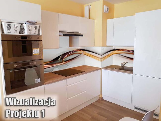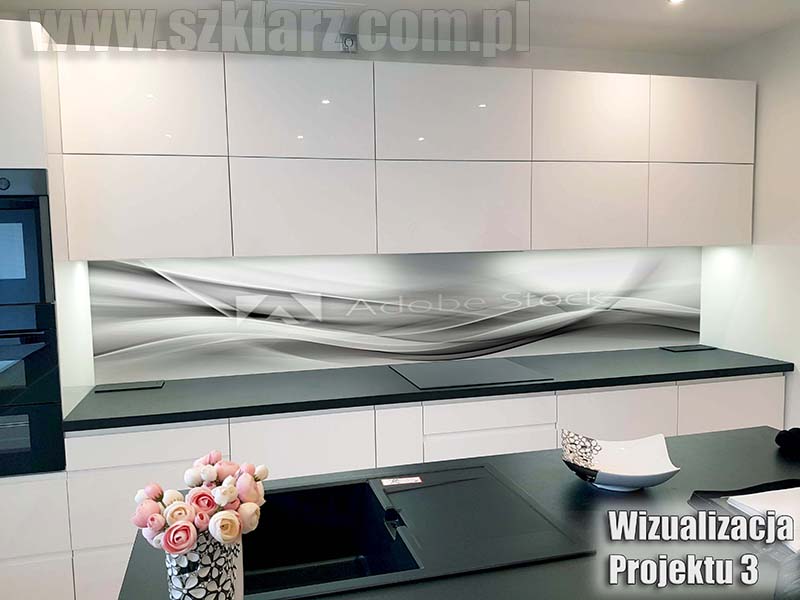 Abstrakcyjna fala ładnie wkomponowana w klimat jasnej kuchni. Bardzo popularny motyw w nowoczesnej kuchni.