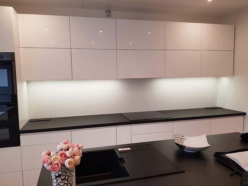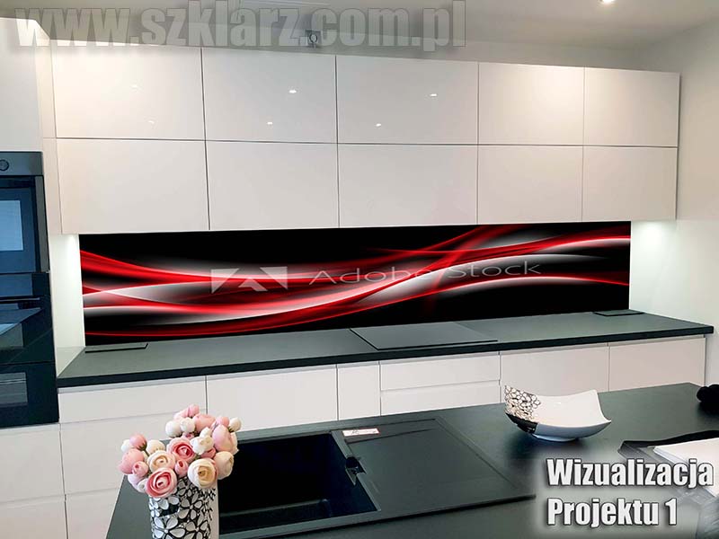 Grafika w popielatym kolorze nawiązująca do kolorów wnętrza (dominuje biel i czerń) dzięki czemu jest możliwy dobór dodatków ożywiających kuchnię w każdym kolorze. Panel wykonany w jednej części bez podziałów. Mocne oświetlenie ledowe.