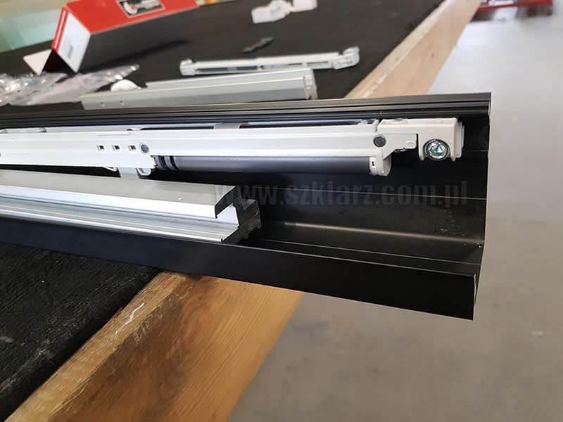 Innowacyjny system przesuwny w kolorze czarnym wyposażony w klamry ze zintegrowanymi wózkami. Rolki systemu posiadają wytrzymałe łożyska kulkowe przekładające się na płynny ruch i długą bezawaryjna pracę.